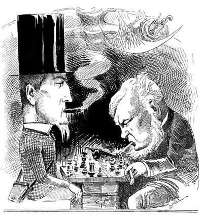 Всех остроумнее оказалась карикатура одного французского журнала. В чреве кита, комфортабельно и уютно устроенном, сидели за столиком Барбикен и Мастон в ожидании прибытия к назначенной цели и спокойно играли в шахматы. Самоотверженные президент и его друг без колебания дали проглотить себя морскому млекопитающему, который, пробравшись под льдами, доставил бы их к полюсу.