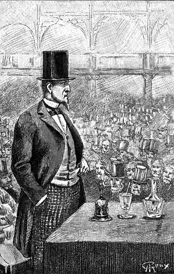Всё это, однако, нимало не помешало журналам с ожесточением наброситься на уважаемого председателя Пушечного клуба и наполнить карикатурами на него столбцы своих листков. Больше всего изощрялись английские журналы. Англичане никак не могли переварить победы доллара над фунтом.