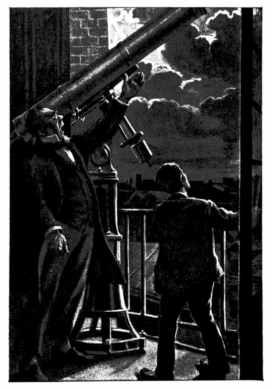 Der betreffende Hühnerstall war nichts mehr und nichts weniger als ein Turm, der zwanzig Fuß über das Dach emporragte oder, um das Kind beim rechten Namen zu nennen, eine Sternwarte. Unter der obern Galerie befand sich ein rundes Zimmer mit vier nach den Haupthimmelsgegenden gerichteten Fenstern. Im Innern standen, auf ihrem Untergestell drehbar, mehrere Fernrohre und einige stark vergrößernde Teleskope, und wenn deren Objektive nicht abgenutzt aussahen, so lag das nicht darin, daß sie unbenutzt gewesen wären. Weit eher war zu befürchten, daß Mr. Dean Forsyth und Omikron dadurch, daß sie mit den Augen immer vor den Okularen ihrer Instrumente lagen, sich die Augen schließlich gründlich verderben würden.