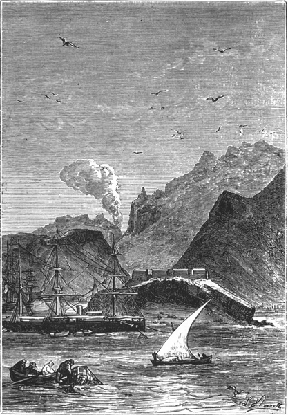 Passepartout schlenderte seiner Gewohnheit nach mitten in dieser Bevölkerung von Somanlis, Banianen, Parsi, Juden, Arabern, Europäern, woraus die 25.000 Einwohner Adens bestehen. Er bewunderte die Befestigungswerke, welche aus dieser Stadt ein Gibraltar für die Indischen Meere machen, und stattliche Zisternen, womit die englischen Ingenieure, zweitausend Jahre nach denen des Königs Salomo, noch beschäftigt waren.