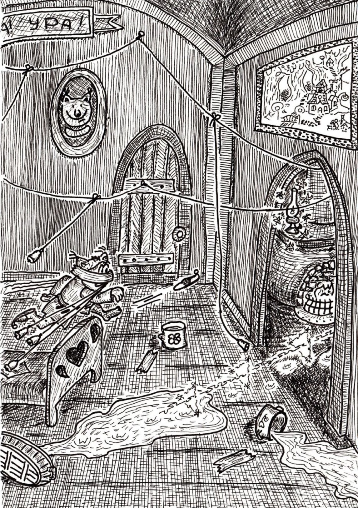 В панике он побежал в комнату друга и увидел, как облепленный бумагой и затянутый верёвками Очертяка, не переставая завывать, прыгает на одной ноге в огромной луже среди перевёрнутых тазов, а колокольчики громко звенят, мотаясь на верёвках, как листья на ветру. Какангел кинулся на помощь другу.