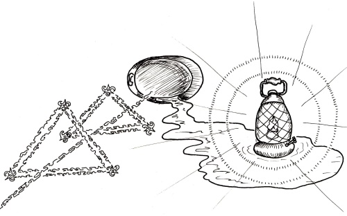 Какангел выскочил следом на крыльцо и увидел, как Очертяка носится по двору с фонарём, заглядывает по все закоулки с криком: «Ага! Вот ты где!»