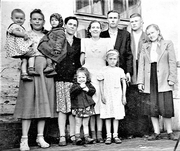 Рублевские (тётя Акулина сидит справа, Ольга и Пётр стоят). Сидельниково, 1950-е