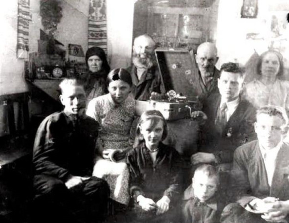 Родня Пономаренко (стоят слева мои прабабушка Соня и прадед Калина). На патефоне звучит песня "Раскинулось море широко". с. Воскресенка, 1940