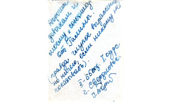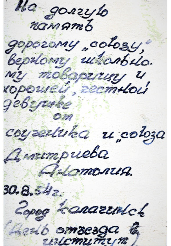 Душа замирает,Баян умолкаетКогда расстаются друзья…Отец мой, окончив 8 классов, поступил в ремесленное училище на Кузбассе. Он присылал оттуда маме свои фотографии, на одной из них, с виньеткой, он написал: «Дарю тому, кого люблю. Оленьке от Анатолия. Не забывай друга».