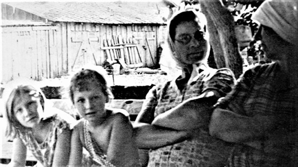 Посиделки на лавочке у подъезда соседнего дома. Слева направо: Галя Вервейко, Люда и тётя Зоя Мерчанские, тётя Вера Данилова. 1966