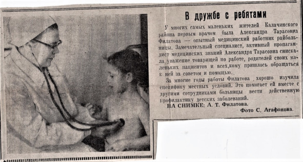 Александру Тарасовну Филатову – педиатра, обожали не только дети, но и их родители. Это была очень добрая, красивая и обаятельная женщина с лучезарной улыбкой. Неравнодушная, всегда переживающая за каждого своего маленького пациента. Она запомнилась многим, как замечательный доктор и светлый жизнерадостный человек. Даже голос её многие помнят спустя десятилетия…