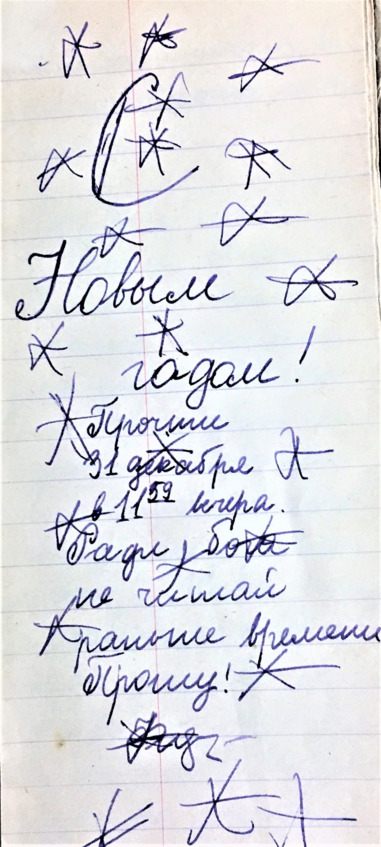 Ещё любили, сделав из простых школьных тетрадок вертикальные блокнотики с завёрнутыми внутрь листами, писать новогодние пожелания, чтобы открыть их в таинственное время – 12 часов ночи, под бой курантов…