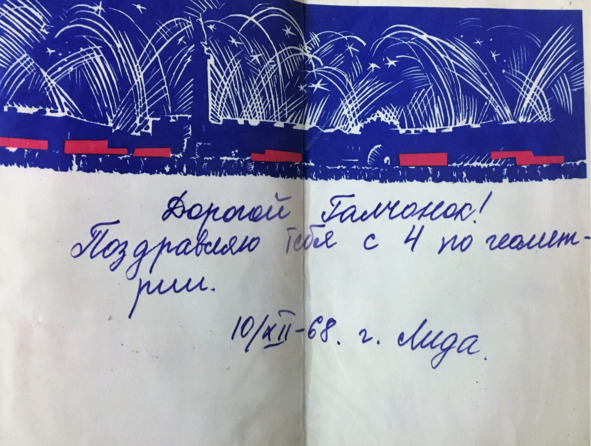 На уроках мы стали озорничать, писать друг другу записки, играя в почту. Например, в моём альбоме хранится открытка «Слава Великому Октябрю» с текстом внутри: «Дорогой Галчонок! Поздравляю тебя с 4 по геометрии. 10.12.1968г. Лида». (Сницаренко).
