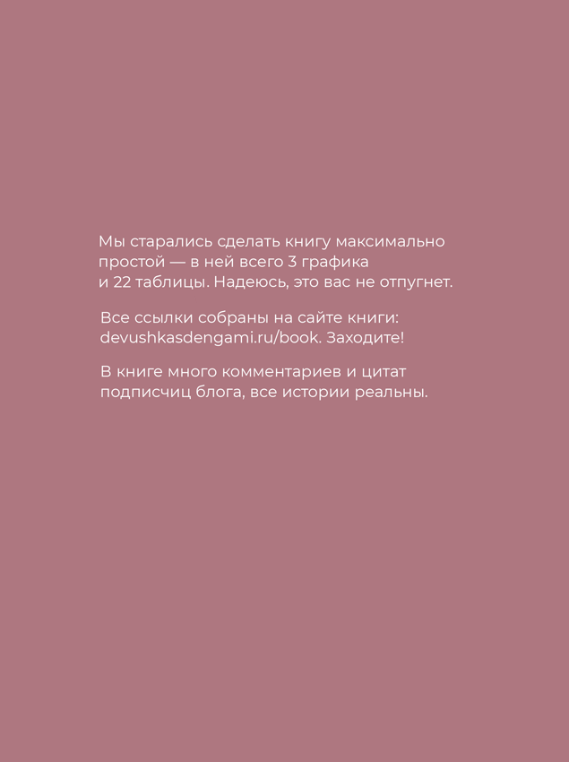 Издательство «Альпина Паблишер» специально сделало эту книгу красивой и приятной на ощупь. Как педиатры рекомендуют нарезать полезную еду кубиками и надевать на зубочистки, чтобы ребенок охотнее ел, так и девушку можно заинтересовать книгой о финансах, если сделать ее эстетически привлекательной.