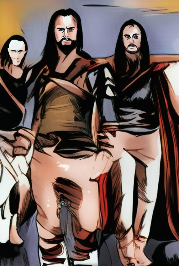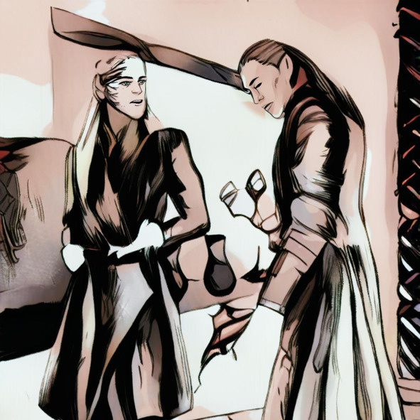 – Отразивших? – Сокрушился мужчина. У него темные волосы до плеч, как и у двух других. На их коже, бледной словно они больны, алмазная крошка. На шее, с правой стороны, на щеке и скулах, а также на лбу. У всех троих: зелкный верх одежды, но только у него, поверх был надет кованный жилет. А у двух других, алые накидки за спиной. – Это они, напали на нас! Мы, лишь защищались!