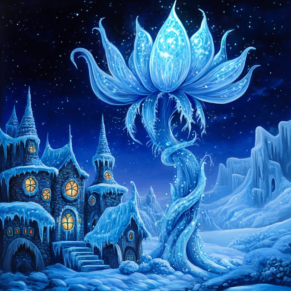 Сначала показался маленький листочек серебристого цвета, затем второй, потом их стало уже пять. Вслед за лепестками из-под земли вырос толстый и прочный, как старая сосулька, стебель, а его корни, такие же упругие и гибкие, как снежные змеи, потянулись к домикам фей, и уже скоро ближайшие домишки покрылись коркой льда…