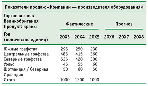 В зависимости от масштаба плана данные о продажах могут быть разбиты на отдельные таблицы по географическим параметрам, по продуктам, по отраслям или по всем этим категориям.