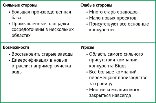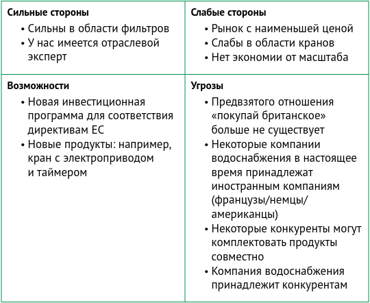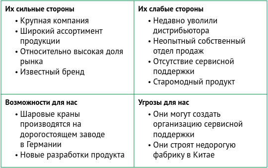 Сильные (strengths) и слабые (weaknesses) стороны в том, что касается возможностей (opportunities) и угроз (threats) на рынке.