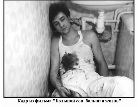 Андрей Ветер: – Замечательно получились зубы! Причём, этот план с разбрызганной по снегу кровью и открытым ртом снят в Битцах, а само падение, какие-нибудь полторы секунды, сняты во дворе. Я очень боялся, что в кадр влезут дома, вокруг ведь девятиэтажки понатыканы. Они мелькнули, но быстро, в расфокусе, так что никто ни разу не обратил внимание на них: ну, какие-то сооружения. Мы же в Битцах мучились, снимали так, чтобы всё будто бы в ковбойском городочке происходит. Это первая сцена «Большого сна». Мы начинали эту сцену на балконе, снимали сквозь стекло, на котором было написано «Saloon». Сергей заглядывал сквозь эту «витрину» в салун. Снимали и обратную точку, его лицо сквозь стекло. А потом уже мы переместились к лесу и там засняли его в полный рост. Сергей поворачивался через плечо ко мне, и я делал наезд на его лицо сквозь стекло, которое мы принесли с собой. На стекле первые буквы от надписи «Saloon». И ещё была картонная модель деревянного дома, не весь дом, а только стена. Поэтому строения подразумевались, но не девятиэтажные дома. И то, что за спиной Сергея мелькнули первые этажи девятиэтажных панельных зданий, никому глаз не резануло. Но обиднее всего, что стекло, которое мы принесли с собой в лес, не сработало. Я так и сяк пристраивался к нему, но что-то не складывалось. Вроде бы всё правильно, но что-то «не так». Я потом на монтаже долго голову ломал, разбирался, в чём проблема, но не сразу понял, в чём «прокол»… Вначале мы снимали сквозь стекло из квартиры, то есть из тёмного пространства, а на природе стекло с надписью было освещено одинаково со всех сторон. Отсюда брак. Много лет этот брак так и оставался в фильме. Только недавно я отрезал этот кадр.