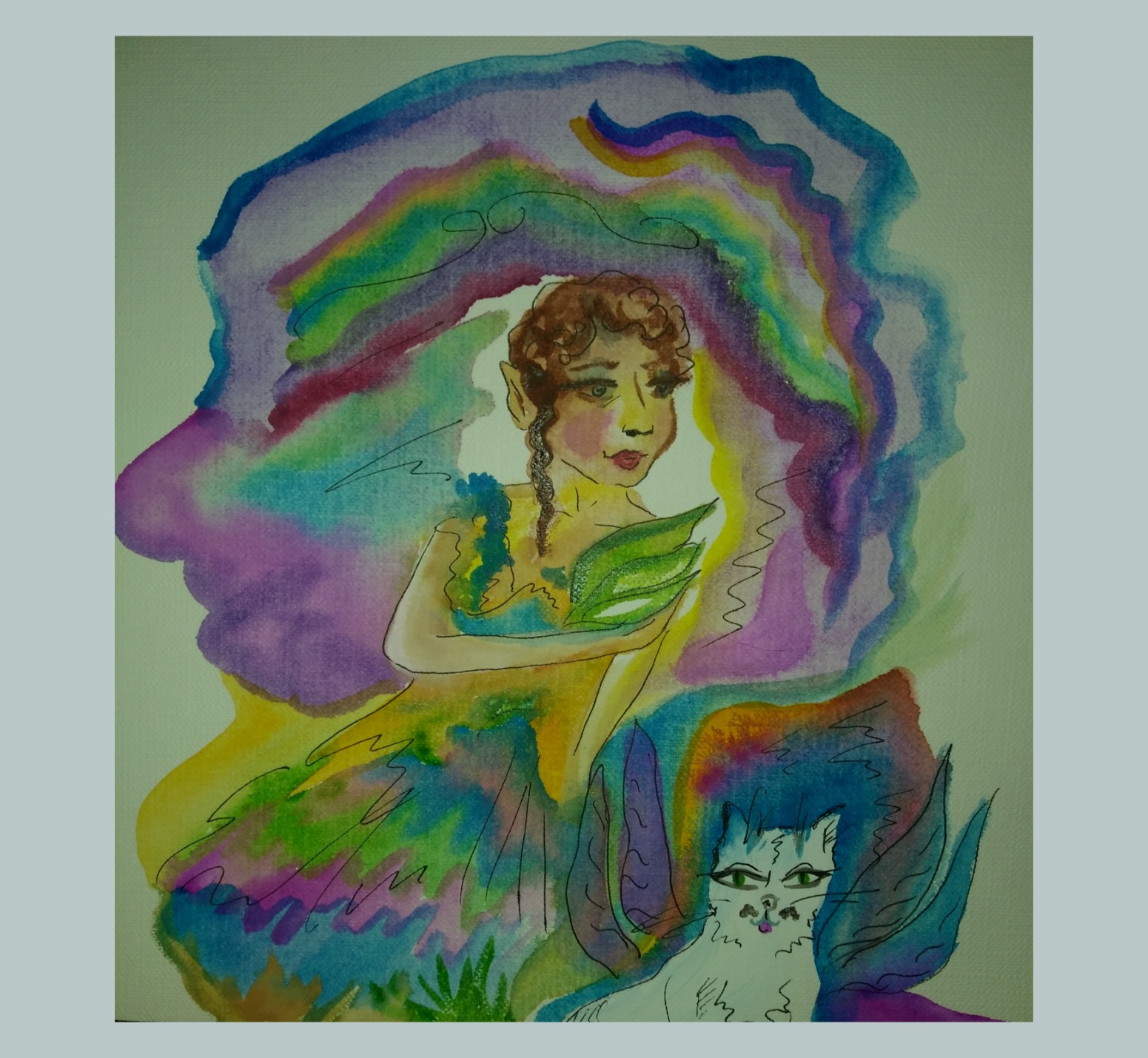 В один солнечный день котёнок Флай решил набрать карандашей и нарисовать радугу в небе. Ему сказали все котята, что рисовать надо на листочке. А он взял и стал рисовать карандашами в воздухе. Вот смотрят котята и смеются. А Флай обиделся и убежал. Наступила зима и стала мама кошка звать Флая, чтоб тот молоко пил, а забралась она на чердак, греться. Флай мигом поднялся и нечаянно опрокинул чашку с молоком. Она полетела так красиво и оставила застывший молочный след в воздухе, как мостик. Флай взял и раскрасил своими карандашами цветными этот мостик, и получилась радуга, зимой. Все удивились такому чуду и извинились перед Флаем. Но котёнок знал, что и летом может быть радуга, он позвал птиц и они стали вместе петь о мечте Флая и просить чтобы каждое деревце и вся природа поддержала его в этом. Потом маленькая эльфийская принцесса пробежала незаметно среди деревьев, и услышала о чем поют птицы, деревья и котёнок. И Флай поднял свои карандаши вверх, и в небе засияла радуга. Все птички обрадовались, котята и коты с кошками удивились. А потом, когда радуга исчезла, Флай снова поднял лапочками карандаши в воздух? И снова засияла радуга.