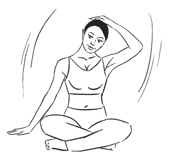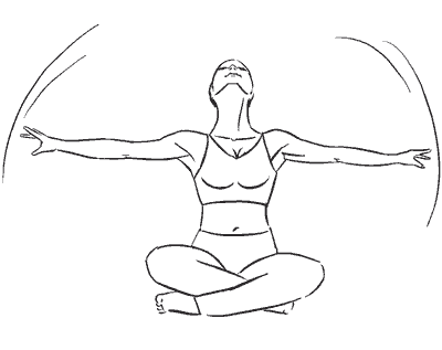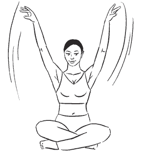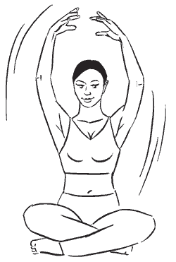 Сядьте прямо, ноги согнуты в коленях и скрещены перед собой, руки подняты вверх над головой и слегка согнуты в локтевых суставах, ладони внутренней стороной направлены друг к другу.