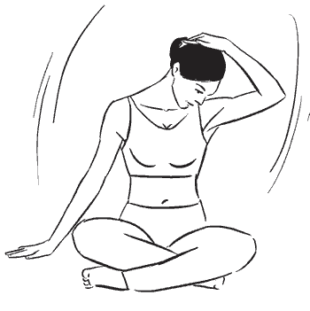 Согните левую руку в локтевом суставе и расположите ладонь на правой стороне головы. Мягко надавливая ладонью, наклоните голову влево. Почувствуйте растяжение мышц шеи. Задержитесь в этом положении на 10–12 счетов.