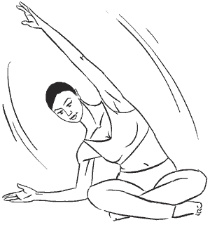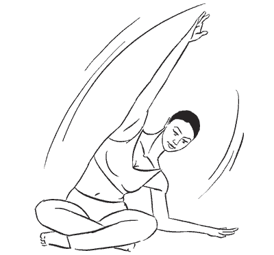 Сохраняя прямое положение спины, потянитесь правой рукой вверх и в сторону так, чтобы почувствовать растяжение боковых мышц туловища. Задержитесь в этом положении на 10–12 счетов.