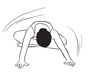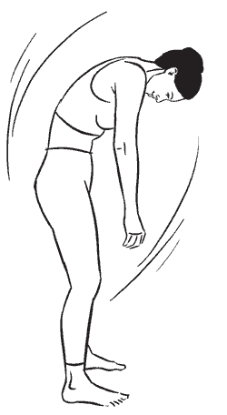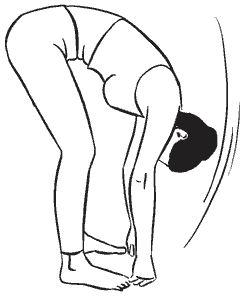 Вдохните, потяните спину, максимально расслабьте шею и голову. На выдохе опустите вниз подбородок, позволяя голове медленно склониться вниз под собственной тяжестью; руки свободно свисают вниз. На вдохе медленно наклоните туловище вниз, позволив голове и рукам повиснуть еще более свободно.