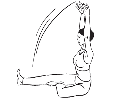 Сядьте прямо, правая нога вытянута вперед, стопа максимально оттянута на себя, левая нога согнута в колене, стопа прижата к внутренней поверхности правого бедра. Руки вытянуты вверх над головой. Из этого положения максимально выпрямите позвоночник вверх, потянувшись за руками. Плечи не поднимать. Задержитесь в этом положении на несколько счетов.