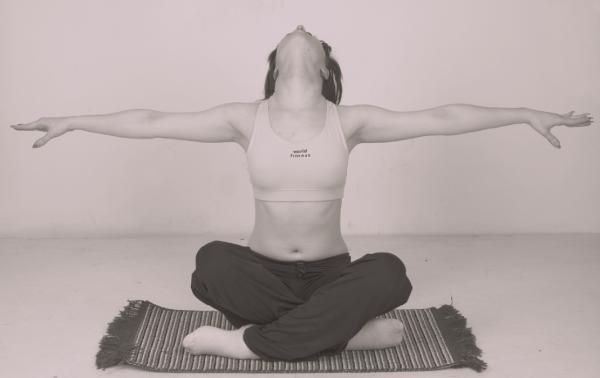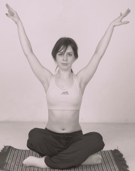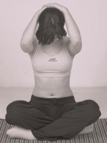 Сядьте прямо, ноги согнуты в коленях и скрещены перед собой, руки подняты вверх над головой и слегка согнуты в локтевых суставах, ладони внутренней стороной направлены друг к другу.