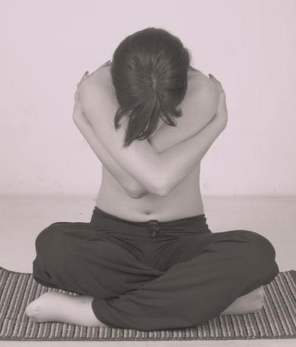 Наклоняя голову вниз и максимально округляя спину, одновременно опустите руки через стороны и, скрещивая их перед грудью, обхватите себя за плечи.