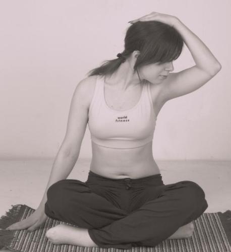 Сядьте прямо, ноги согнуты в коленях и скрещены перед собой. Левая рука согнута в локтевом суставе и ладонью и предплечьем прижата к полу. Правая рука вытянута вверх, ладонь внутренней стороной направлена влево.