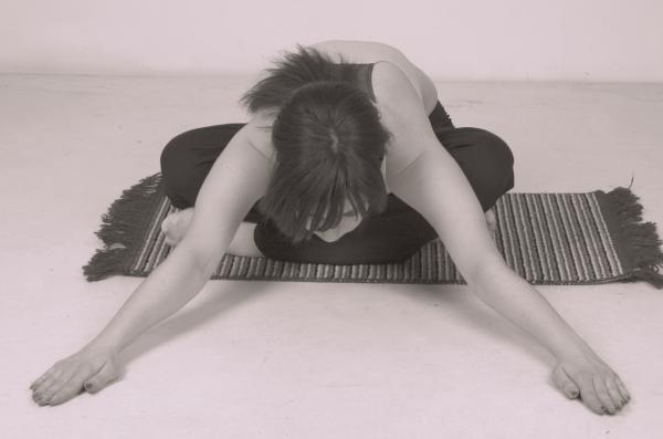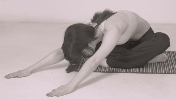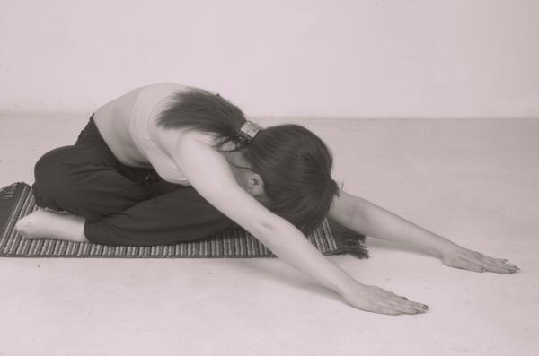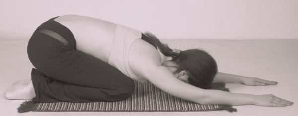 Станьте на четвереньки, колени разведены, стопы соединены друг с другом (верхняя часть стоп расположена на полу). Медленно потяните спину; не поднимая головы и не отрывая от поверхности ладони, опустите ягодицы на пятки (ни в коем случае не садитесь между ног), округлите спину. Для максимального растягивания позвоночника, вытягивайте руки вперед. Расслабьтесь и отдохните в этом положении, затем сделайте десять вдохов и выдохов. На последнем выдохе медленно, выпрямляя позвонок за позвонком, вернитесь в исходное положение.