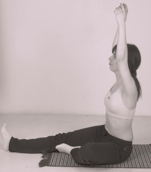 Сядьте прямо, правая нога вытянута вперед, стопа максимально оттянута на себя, левая нога согнута в колене, стопа прижата к внутренней поверхности правого бедра. Руки вытянуты вверх над головой. Из этого положения максимально выпрямите позвоночник вверх, потянувшись за руками. Плечи не поднимать. Задержитесь в этом положении на несколько счетов.