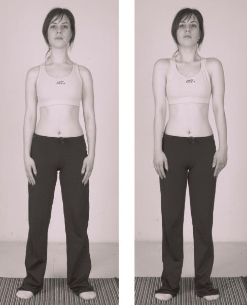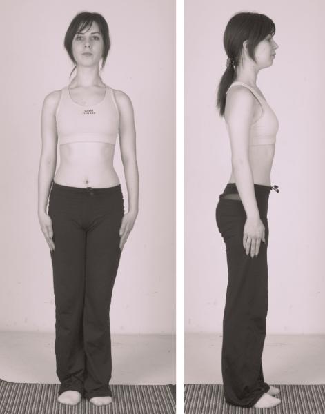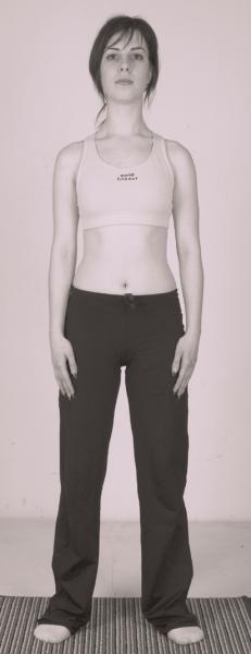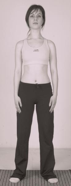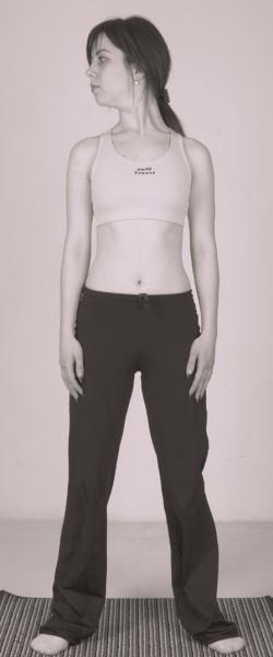 Стоя прямо, ноги на ширине бедер, вес тела равномерно распределен на обе ноги, колени слегка согнуты и расслаблены, таз в нейтральном положении, копчик направлен вниз.