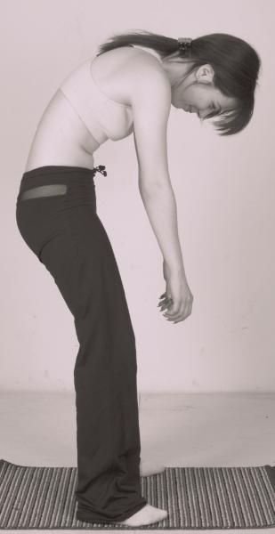 На выдохе опустите вниз подбородок, позволяя голове медленно склониться вниз под собственной тяжестью; руки свободно свисают вниз. На вдохе медленно наклоните туловище вниз, позволив голове и рукам повиснуть еще более свободно.
