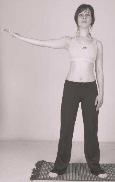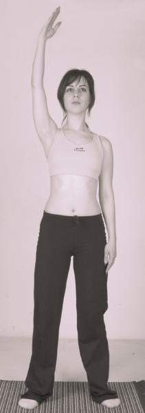 На вдохе, вытягиваясь вверх, поднимите правую руку. Не поднимайте лопатки (насколько это возможно), держите расслабленными шею и плечи. В конце движения разверните ладонь вовнутрь.