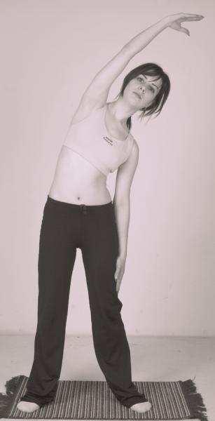 Сохраняя прямое положение спины, потянитесь правой рукой вверх и в сторону так, чтобы почувствовать растяжение боковых мышц туловища. Задержитесь в этом положении на 10–12 счетов.
