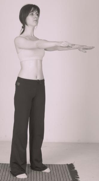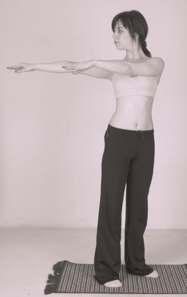 Стоя прямо, ноги на ширине бедер, вес тела равномерно распределен на обе ноги, колени слегка согнуты, руки выпрямлены перед собой на уровне плеч. Вдохните, потянитесь макушкой вверх, на выдохе подтяните мышцы живота и тазового дна, удерживая такое положение на протяжении всего упражнения. Сохраняя естественное дыхание, выполните попеременные повороты корпуса вправо и влево. Каждый раз возвращайтесь в исходное положение. Повторите упражнение 12 раз.