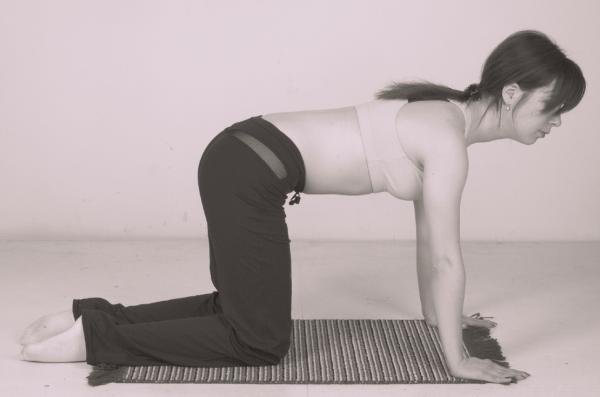 Выдохните и опустите копчик вниз, подавая лобковую кость вперед. Посмотрите на фото: туловище полностью округлено и расслаблено. Медленно и плавно вернитесь в исходное положение. Повторите упражнение 5 раз.