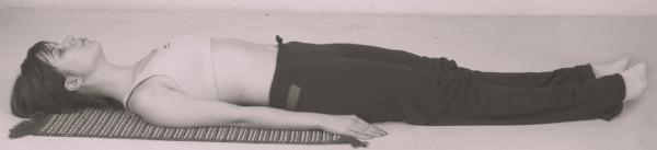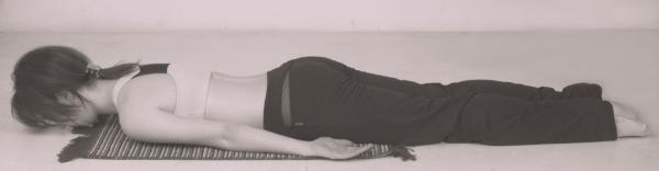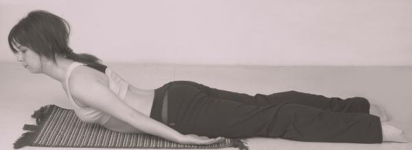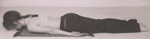 Лежа на животе (для комфорта положите под лоб небольшое свернутое полотенце), руки выпрямлены вдоль туловища, ладони направлены к бедрам, ноги вместе, носки вытянуты, шея выпрямлена.