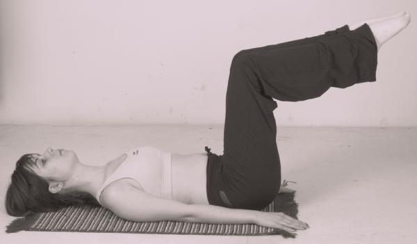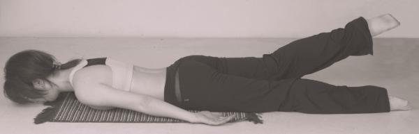 Займите исходное положение предыдущего упражнения. Вдохните, потянитесь во всю длину своего тела. На выдохе напрягите мышцы живота и ягодиц и поднимите вверх левую ногу так, чтобы бедро и верхняя часть стопы были направлены строго вниз. Задержитесь в этом положении на два счета и медленно опустите ногу в исходное положение.