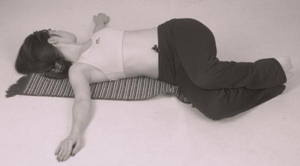 Сочетайте движения с дыханием: вдох – пять покачиваний, выдох – пять покачиваний. После выполнения медленно опустите руки и голову на пол. Чтобы расслабить мышцы шеи, слегка опустите подбородок к груди.