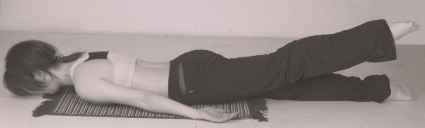 Вдохните и потянитесь во всю длину своего тела. На выдохе напрягите мышцы живота, соедините лопатки и приподнимите над полом верхнюю часть тела. Пальцы выпрямлены. Не откидывайте голову назад, взгляд все время направлен в пол. Прижимайте бедра друг к другу, стопы от поверхности не отрывать.
