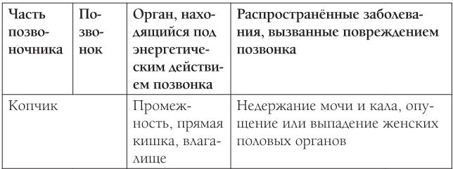 Для того чтобы подчеркнуть важность заботы о позвоночнике, приведу ниже в таблице отдельно по каждому позвонку его энергетическую зону действия и наиболее распространенные патологии.
