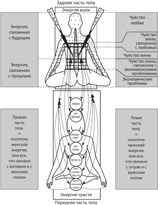 Спереди. Передняя часть тела является выразителем энергии чувств. Все недомогания на передней части тела связаны с негативными чувствами, которые Вы вобрали в себя.