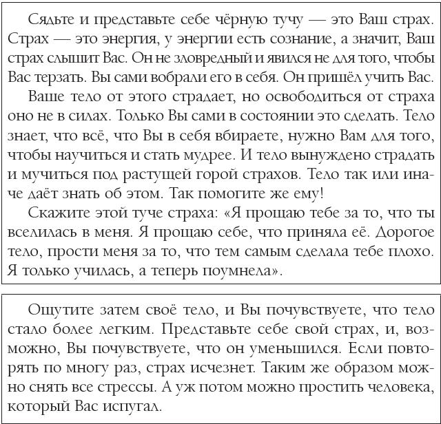 До тех пор пока в Вас сидит Страх, Ваше тело знает, что Вы нуждаетесь в запугивании, и Вы будете сталкиваться с людьми и с ситуациями, которые будут вызывать у Вас страх. Когда же Вы победите в душе страх, то, словно по мановению волшебной палочки, страшное Вам уже не встретится.