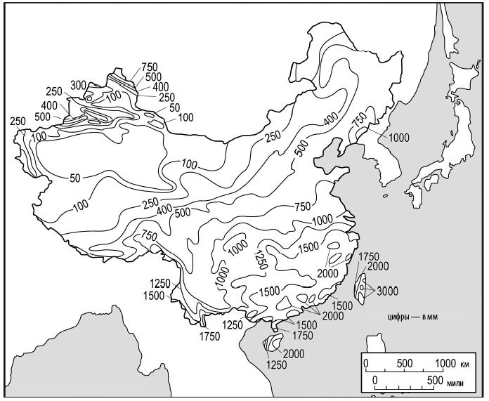 Рис. 2.2. Ежегодные осадки в Китае. Источник: Zhonghua Renmin Gongheguo Dituce [Атлас КНР]. Картограф: Мэри Ли Эггарт