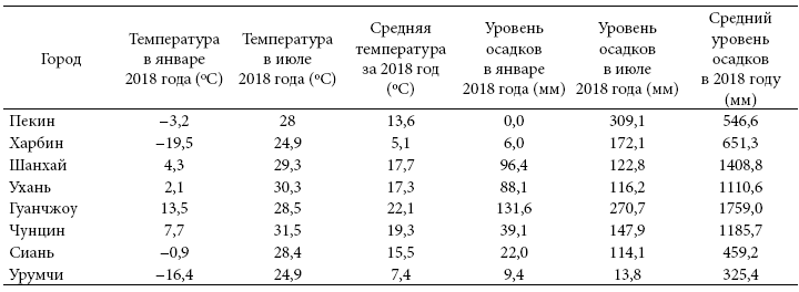 Таблица 2.1. Температура и осадки в отдельных китайских городах (2018 год)