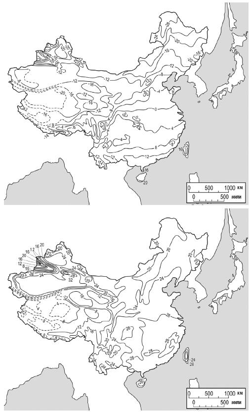 Рис. 2.4. Графики средних январских и июльских температур в Китае. Составлено на основе [Zhang, Lin 1992: 38, 47]. Картограф: Мэри Ли Эггарт