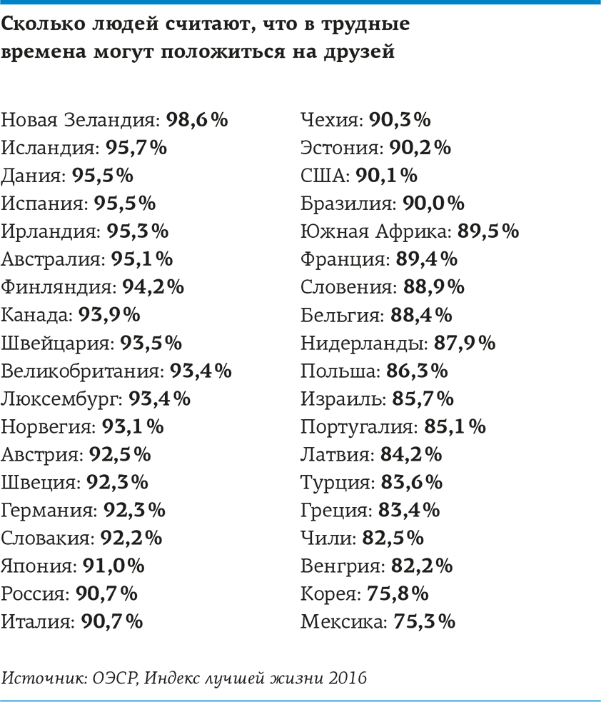 И мы в Институте исследования счастья, и составители Всемирного доклада о счастье обнаружили, что в счастливых странах сильнее развито чувство общности, а у счастливых людей всегда есть те, на кого они могут опереться в случае необходимости. Не случайно датчане не только самые счастливые люди в мире – они чаще других встречаются с друзьями и родственниками и уверены, что друзья поддержат их в трудный момент.
