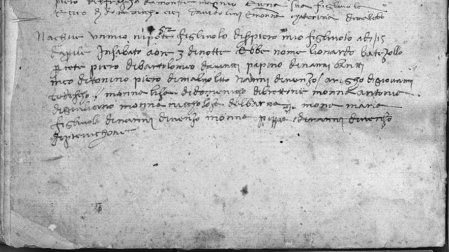 Родился у меня внук, от сера Пьеро, моего сына, 15 апреля, в субботу в 3-м часу ночи. Ему дали имя Леонардо, крестил его священник Пьетро Бартоломео да Винчи[21]…