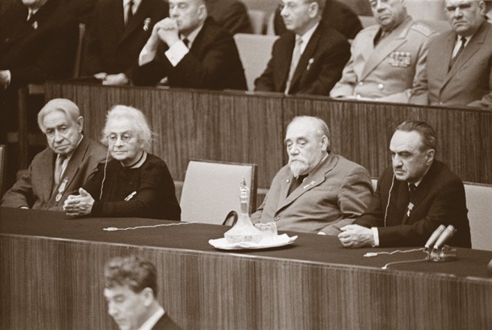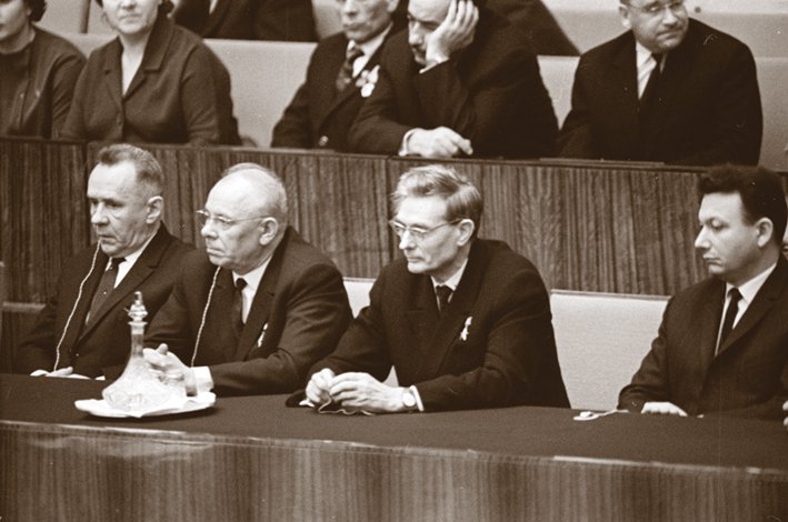 Л.И. Брежнев поздравляет профессорско-преподавательский состав с 200-летием со дня основания 1-го Московского медицинского института им. И.М. Сеченова. Среди присутствующих – Н.В. Подгорный