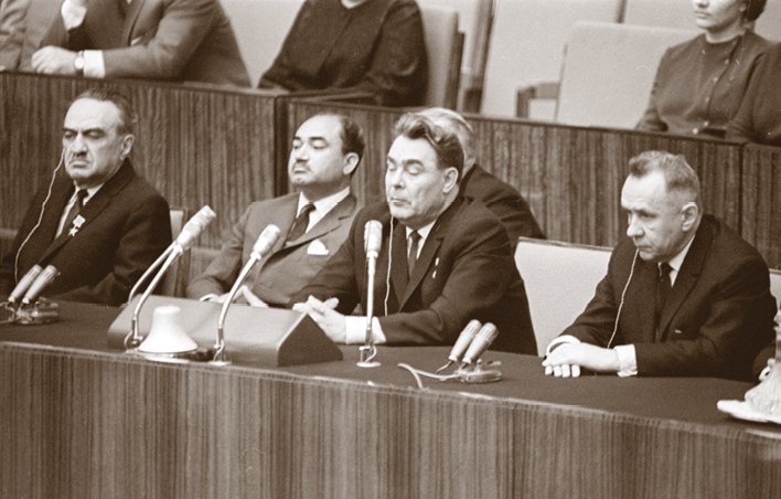 Л.И. Брежнев открывает XXIII съезд КПСС. В президиуме А.П. Кириленко, Н.М. Шверник и др.